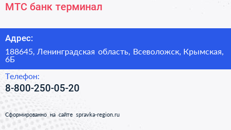 МТС банк, терминал по адресу 188645, Ленинградская область, Всеволожск, Крымская, 6Б в дальнейшем Организация, размещена в следующих категориях: