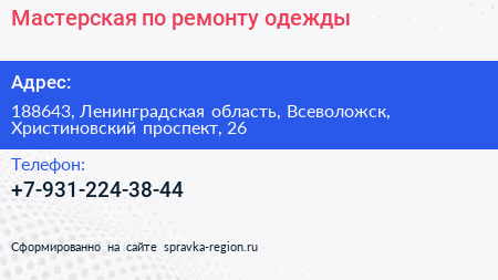 Мастерская по ремонту одежды по адресу 188643, Ленинградская область, Всеволожск, Христиновский проспект, 26 в дальнейшем Организация, размещена в следующих категориях: