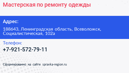 Мастерская по ремонту одежды по адресу 188643, Ленинградская область, Всеволожск, Социалистическая, 102а в дальнейшем Организация, размещена в следующих категориях: