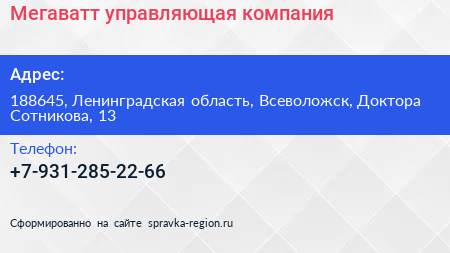 Мегаватт, управляющая компания по адресу 188645, Ленинградская область, Всеволожск, Доктора Сотникова, 13 в дальнейшем Организация, размещена в следующих категориях: