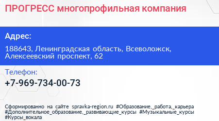 ПРОГРЕСС, многопрофильная компания по адресу 188643, Ленинградская область, Всеволожск, Алексеевский проспект, 62 в дальнейшем Организация, размещена в следующих категориях:
