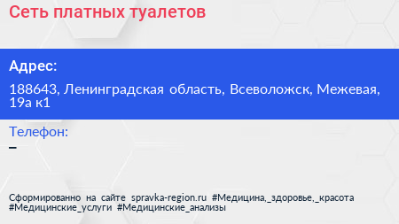 Сеть платных туалетов по адресу 188643, Ленинградская область, Всеволожск, Межевая, 19а к1 в дальнейшем Организация, размещена в следующих категориях: