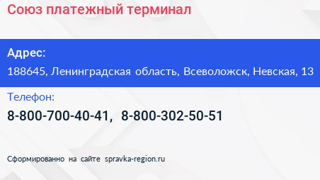 Союз, платежный терминал по адресу 188645, Ленинградская область, Всеволожск, Невская, 13 в дальнейшем Организация, размещена в следующих категориях: