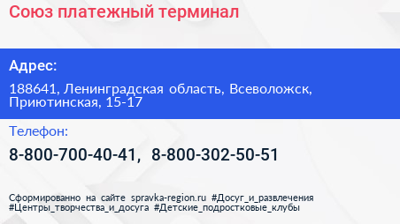 Союз, платежный терминал по адресу 188641, Ленинградская область, Всеволожск, Приютинская, 15-17 в дальнейшем Организация, размещена в следующих категориях: