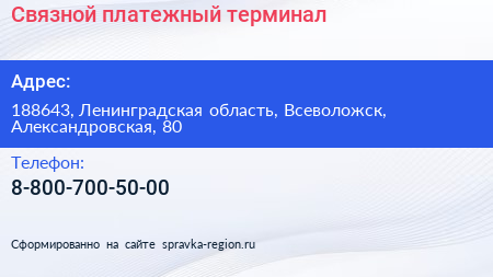 Связной, платежный терминал по адресу 188643, Ленинградская область, Всеволожск, Александровская, 80 в дальнейшем Организация, размещена в следующих категориях: