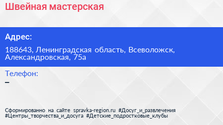 Швейная мастерская по адресу 188643, Ленинградская область, Всеволожск, Александровская, 75а в дальнейшем Организация, размещена в следующих категориях: