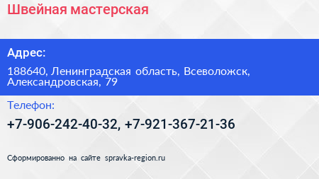 Швейная мастерская по адресу 188640, Ленинградская область, Всеволожск, Александровская, 79 в дальнейшем Организация, размещена в следующих категориях:
