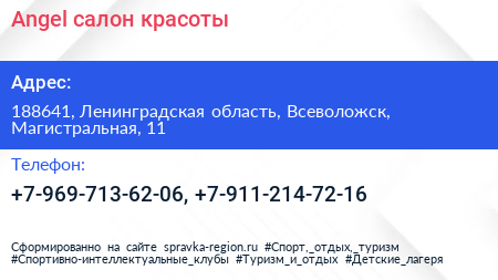 Angel, салон красоты по адресу 188641, Ленинградская область, Всеволожск, Магистральная, 11 в дальнейшем Организация, размещена в следующих категориях: