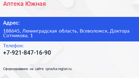 Аптека Южная по адресу 188645, Ленинградская область, Всеволожск, Доктора Сотникова, 1 в дальнейшем Организация, размещена в следующих категориях: