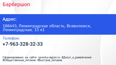 Барбершоп по адресу 188643, Ленинградская область, Всеволожск, Ленинградская, 15 к1 в дальнейшем Организация, размещена в следующих категориях: