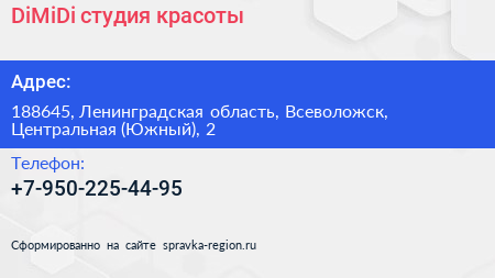 DiMiDi, студия красоты по адресу 188645, Ленинградская область, Всеволожск, Центральная (Южный), 2 в дальнейшем Организация, размещена в следующих категориях:
