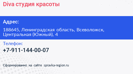 Diva, студия красоты по адресу 188645, Ленинградская область, Всеволожск, Центральная (Южный), 4 в дальнейшем Организация, размещена в следующих категориях: