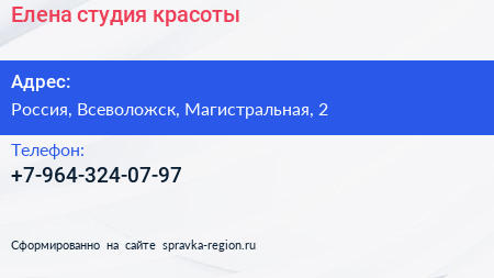 Елена, студия красоты по адресу Svetlana, 2, Магистральная улица, Щеглово, Щегловское сельское поселение, Всеволожский район, Ленинградская область, Северо-Западный федеральный округ, 188676, Россия в дальнейшем Организация, размещена в следующих категориях: