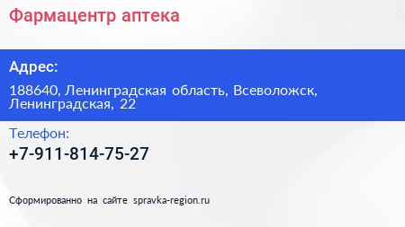 Фармацентр, аптека по адресу 188640, Ленинградская область, Всеволожск, Ленинградская, 22 в дальнейшем Организация, размещена в следующих категориях: