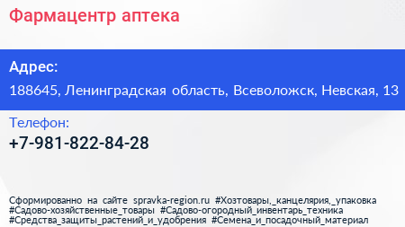 Фармацентр, аптека по адресу 188645, Ленинградская область, Всеволожск, Невская, 13 в дальнейшем Организация, размещена в следующих категориях: