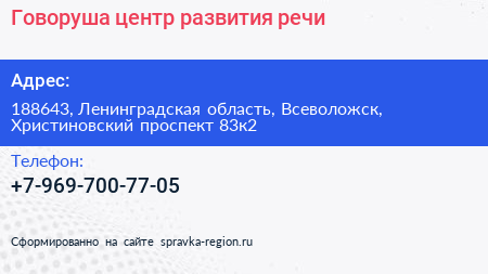 Говоруша, центр развития речи по адресу 188643, Ленинградская область, Всеволожск, Христиновский проспект 83к2 в дальнейшем Организация, размещена в следующих категориях: