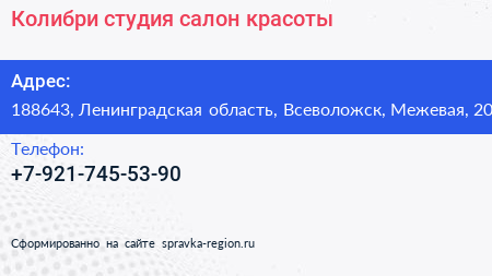 Колибри, студия-салон красоты по адресу 188643, Ленинградская область, Всеволожск, Межевая, 20 в дальнейшем Организация, размещена в следующих категориях: