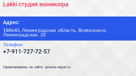 Lakki, студия маникюра по адресу 188640, Ленинградская область, Всеволожск, Ленинградская, 32 в дальнейшем Организация, размещена в следующих категориях: