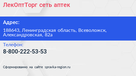 ЛекОптТорг, сеть аптек по адресу 188643, Ленинградская область, Всеволожск, Александровская, 82а в дальнейшем Организация, размещена в следующих категориях: