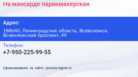 На мансарде, парикмахерская по адресу 188640, Ленинградская область, Всеволожск, Всеволожский проспект, 49 в дальнейшем Организация, размещена в следующих категориях: