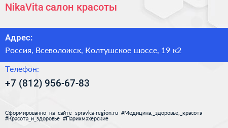 NikaVita, салон красоты по адресу 19 к2, Колтушское шоссе, Подгорное, Кальтино, Город Всеволожск, Всеволожский район, Ленинградская область, Северо-Западный федеральный округ, 188643, Россия в дальнейшем Организация, размещена в следующих категориях: