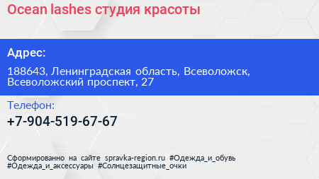 Ocean lashes, студия красоты по адресу 188643, Ленинградская область, Всеволожск, Всеволожский проспект, 27 в дальнейшем Организация, размещена в следующих категориях: