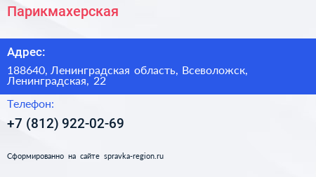 Парикмахерская по адресу 188640, Ленинградская область, Всеволожск, Ленинградская, 22 в дальнейшем Организация, размещена в следующих категориях: