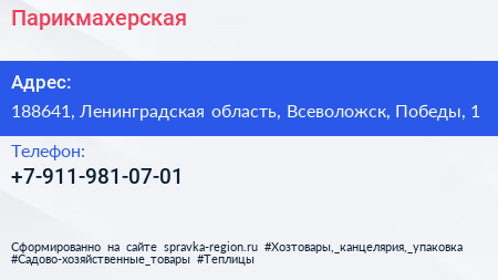 Парикмахерская по адресу 188641, Ленинградская область, Всеволожск, Победы, 1 в дальнейшем Организация, размещена в следующих категориях: