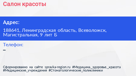 Салон красоты по адресу 188641, Ленинградская область, Всеволожск, Магистральная, 9 лит Б в дальнейшем Организация, размещена в следующих категориях: