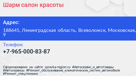 Шарм, салон красоты по адресу 188645, Ленинградская область, Всеволожск, Московская, 9 в дальнейшем Организация, размещена в следующих категориях: