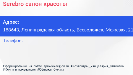 Serebro, салон красоты по адресу 188643, Ленинградская область, Всеволожск, Межевая, 21 в дальнейшем Организация, размещена в следующих категориях: