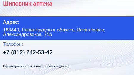 Шиповник, аптека по адресу 188643, Ленинградская область, Всеволожск, Александровская, 75а в дальнейшем Организация, размещена в следующих категориях: