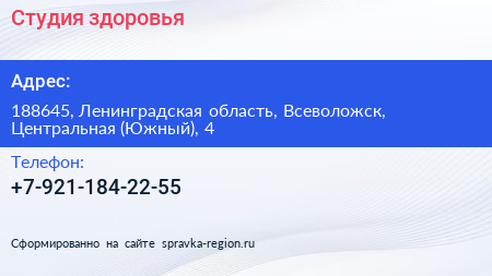 Студия здоровья по адресу 188645, Ленинградская область, Всеволожск, Центральная (Южный), 4 в дальнейшем Организация, размещена в следующих категориях: