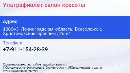 Ультрафиолет, салон красоты по адресу 188643, Ленинградская область, Всеволожск, Христиновский проспект, 26 к1 в дальнейшем Организация, размещена в следующих категориях: