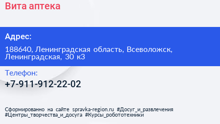 Вита, аптека по адресу 188640, Ленинградская область, Всеволожск, Ленинградская, 30 к3 в дальнейшем Организация, размещена в следующих категориях: