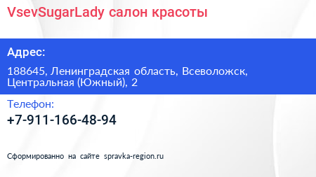 VsevSugarLady, салон красоты по адресу 188645, Ленинградская область, Всеволожск, Центральная (Южный), 2 в дальнейшем Организация, размещена в следующих категориях: