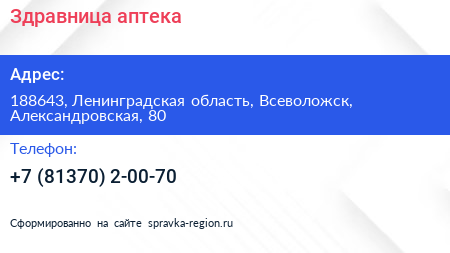 Здравница, аптека по адресу 188643, Ленинградская область, Всеволожск, Александровская, 80 в дальнейшем Организация, размещена в следующих категориях: