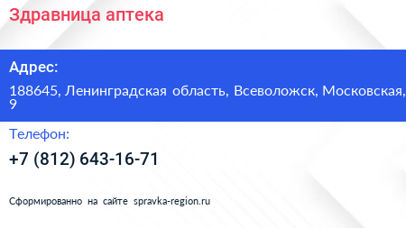Здравница, аптека по адресу 188645, Ленинградская область, Всеволожск, Московская, 9 в дальнейшем Организация, размещена в следующих категориях: