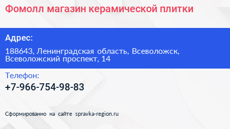 Фомолл, магазин керамической плитки по адресу 188643, Ленинградская область, Всеволожск, Всеволожский проспект, 14 в дальнейшем Организация, размещена в следующих категориях:
