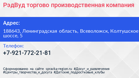 РэдВуд, торгово-производственная компания по адресу 188643, Ленинградская область, Всеволожск, Колтушское шоссе, 5 в дальнейшем Организация, размещена в следующих категориях: