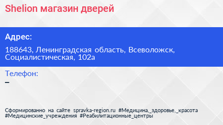 Shelion, магазин дверей по адресу 188643, Ленинградская область, Всеволожск, Социалистическая, 102а в дальнейшем Организация, размещена в следующих категориях: