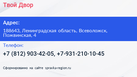 Твой Двор по адресу 188643, Ленинградская область, Всеволожск, Пожвинская, 4 в дальнейшем Организация, размещена в следующих категориях: