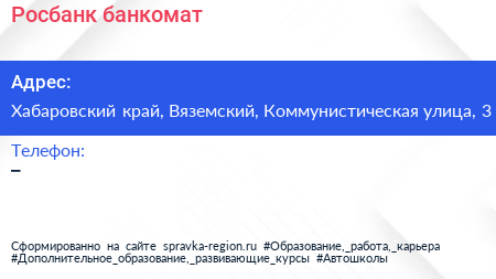 Росбанк, банкомат по адресу Хабаровский край, Вяземский, Коммунистическая улица, 3 в дальнейшем Организация, размещена в следующих категориях: