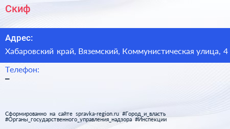 Скиф по адресу Хабаровский край, Вяземский, Коммунистическая улица, 4 в дальнейшем Организация, размещена в следующих категориях: