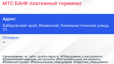 МТС-БАНК, платежный терминал по адресу Хабаровский край, Вяземский, Коммунистическая улица, 11 в дальнейшем Организация, размещена в следующих категориях: