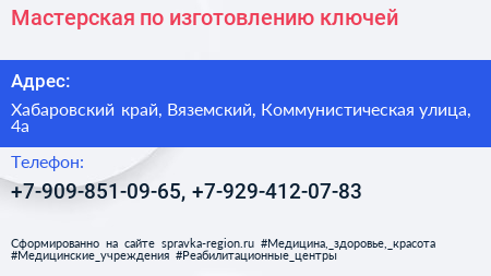 Мастерская по изготовлению ключей по адресу Хабаровский край, Вяземский, Коммунистическая улица, 4а в дальнейшем Организация, размещена в следующих категориях: