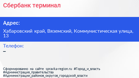 Сбербанк, терминал по адресу Хабаровский край, Вяземский, Коммунистическая улица, 13 в дальнейшем Организация, размещена в следующих категориях: