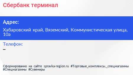 Сбербанк, терминал по адресу Хабаровский край, Вяземский, Коммунистическая улица, 10а в дальнейшем Организация, размещена в следующих категориях: