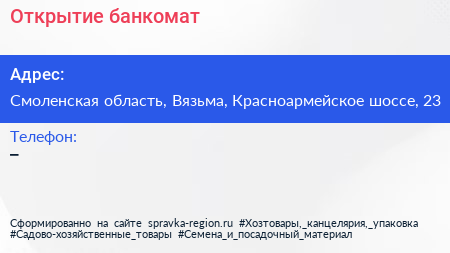 Открытие, банкомат по адресу Смоленская область, Вязьма, Красноармейское шоссе, 23 в дальнейшем Организация, размещена в следующих категориях: