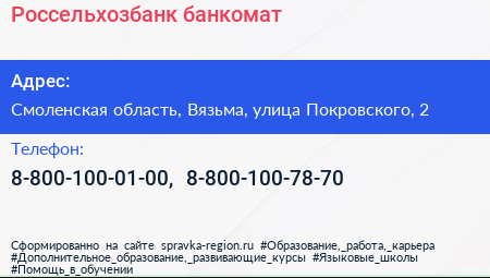 Россельхозбанк, банкомат по адресу Смоленская область, Вязьма, улица Покровского, 2 в дальнейшем Организация, размещена в следующих категориях: